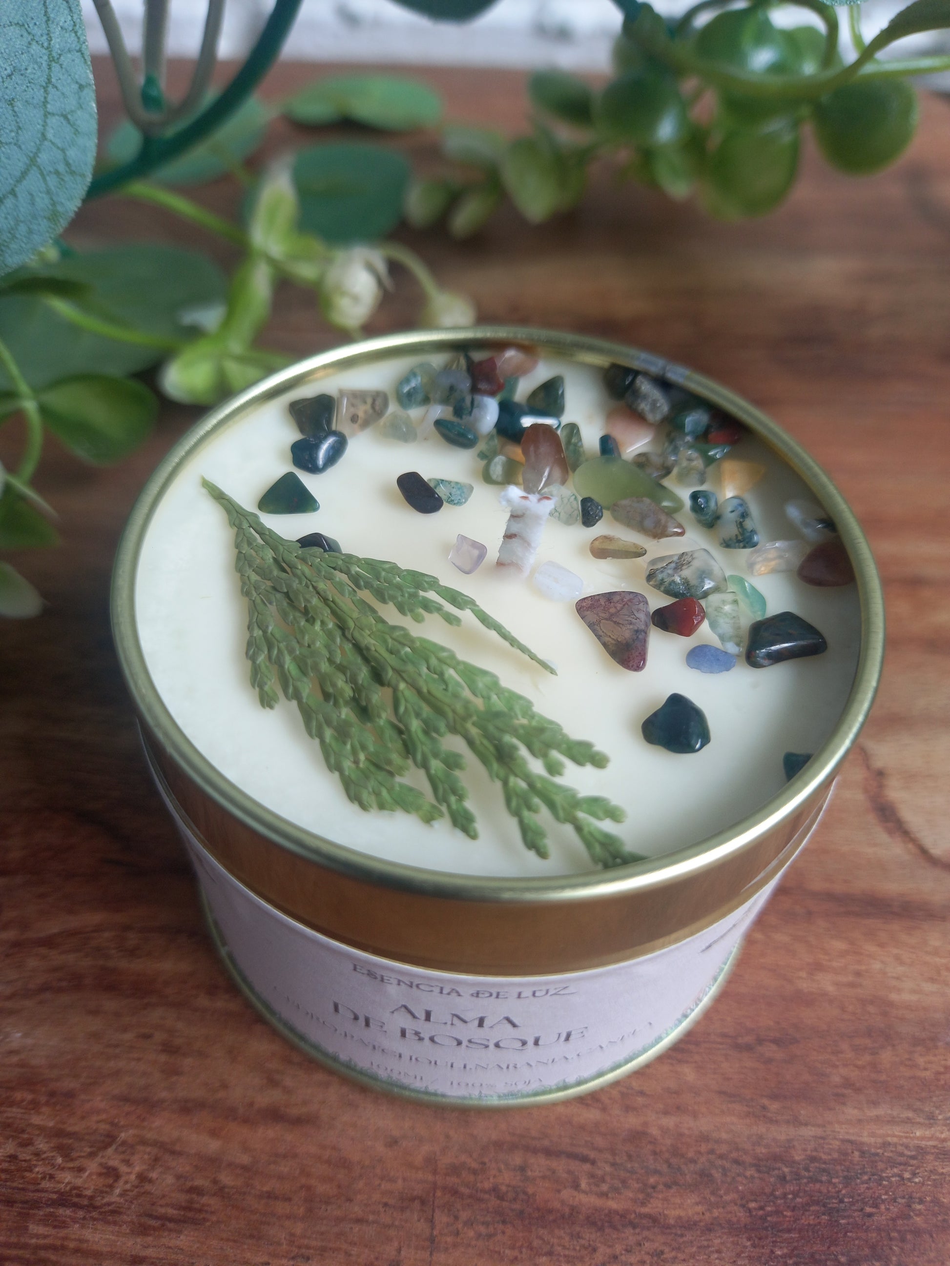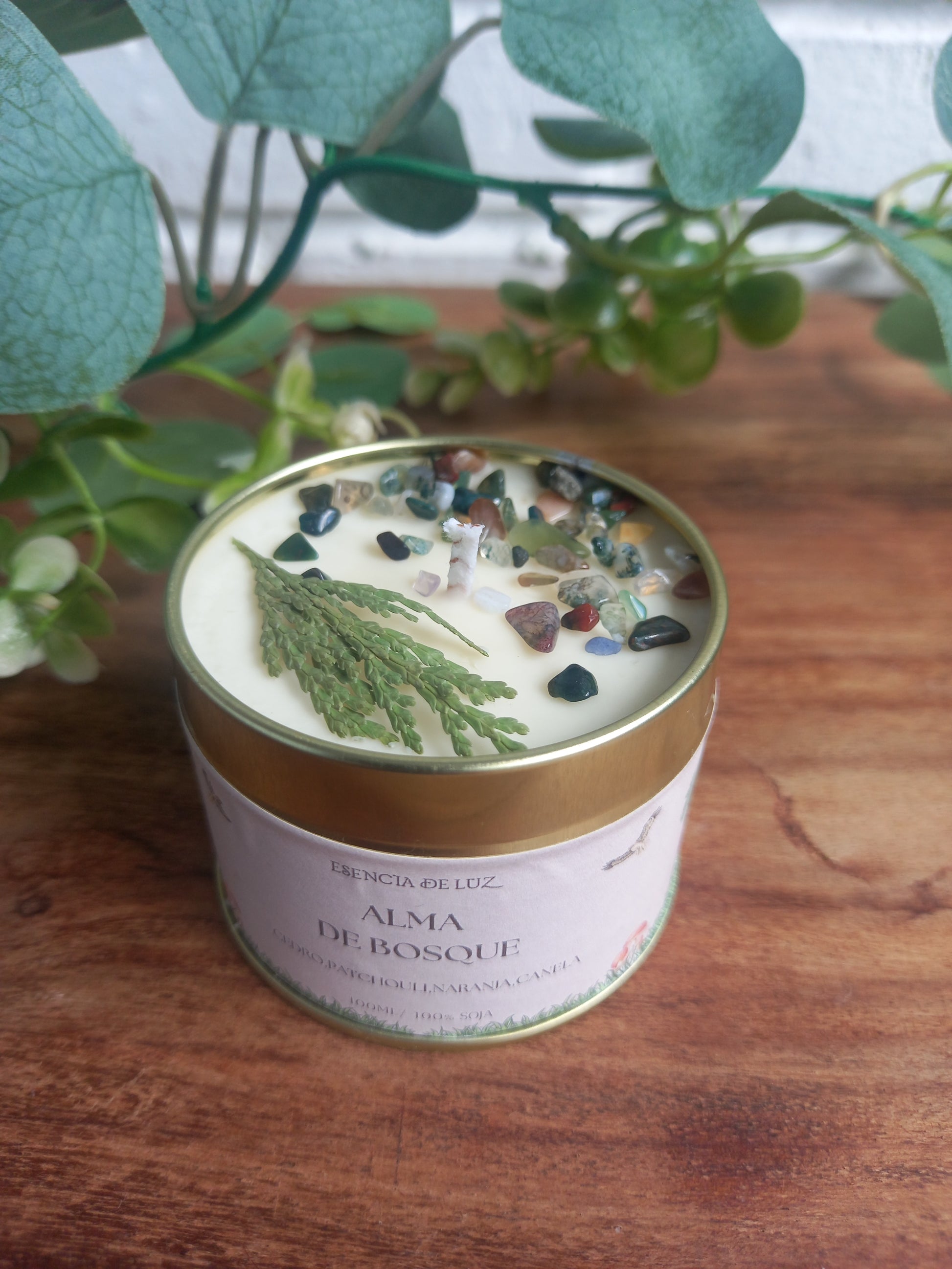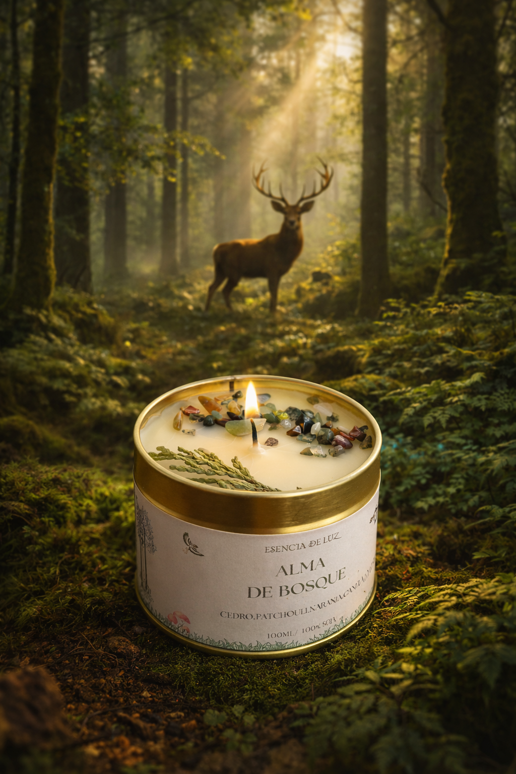 Adéntrate en un bosque y siente el aroma, su energía y deja que te envuelva. Abraza a un árbol, siente la tierra al caminar, escucha los sonidos de la naturaleza, los pájaros,el rio, siente la brisa del bosque que te acaricie, te susurre. Con aceites esenciales de Cedro, Patchouli ,naranja y un toque de canela. Decoración mineral ágata musgosa que te conecta con la naturaleza y ramitas de cedro o ciprés.
