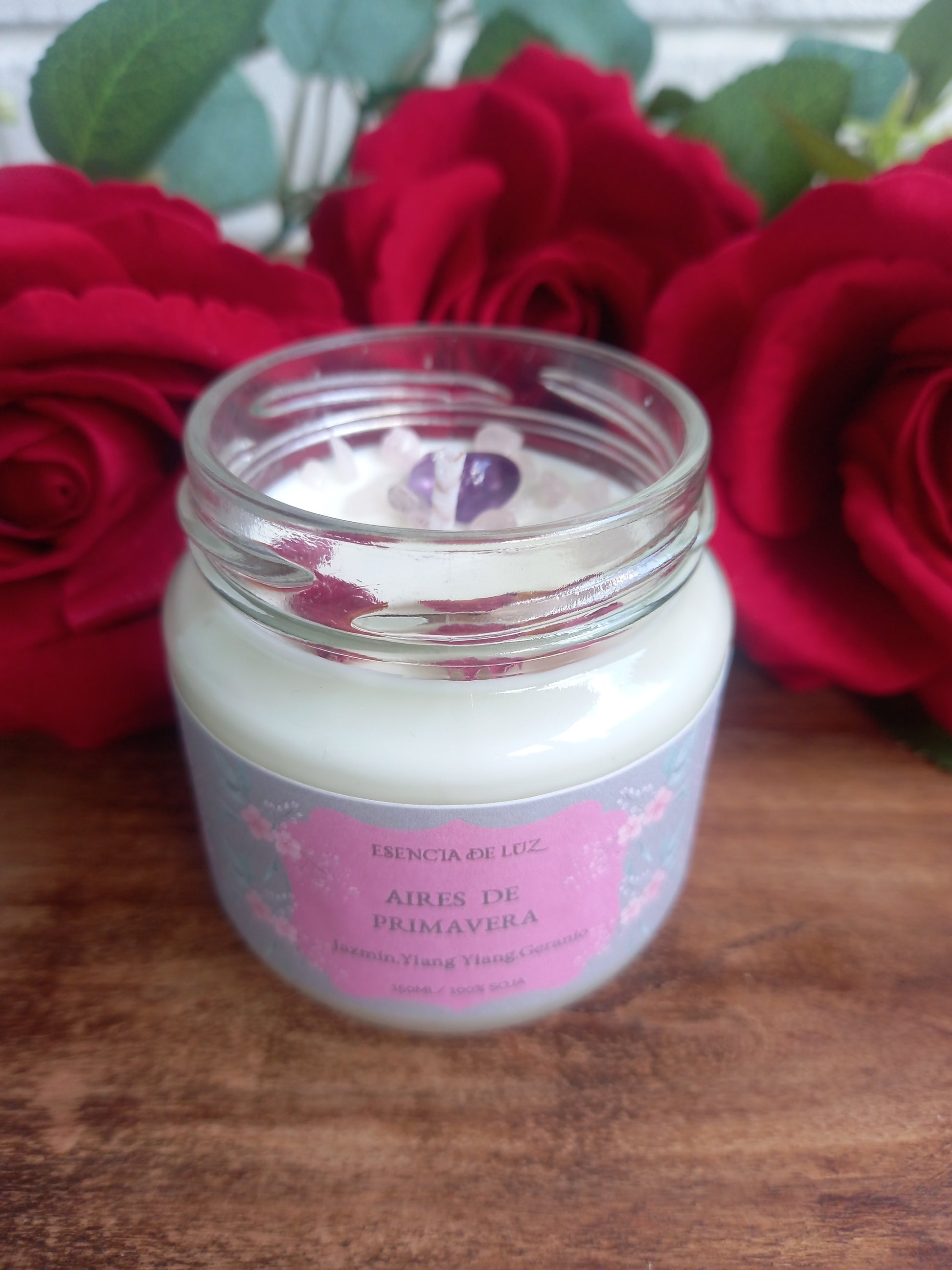 Decoración chips de cuarzo rosa,el cuarzo del amor y flores para completar esta velita tan suave y delicada.